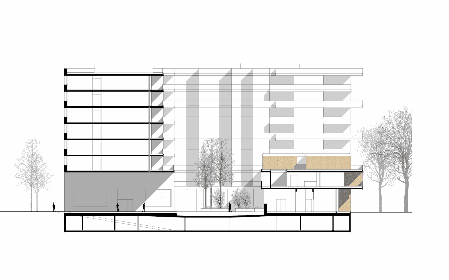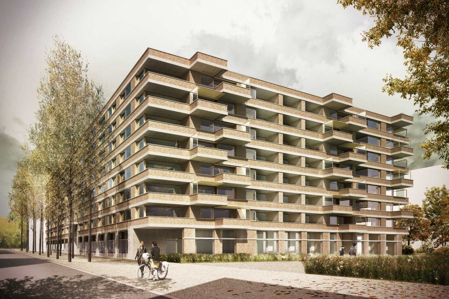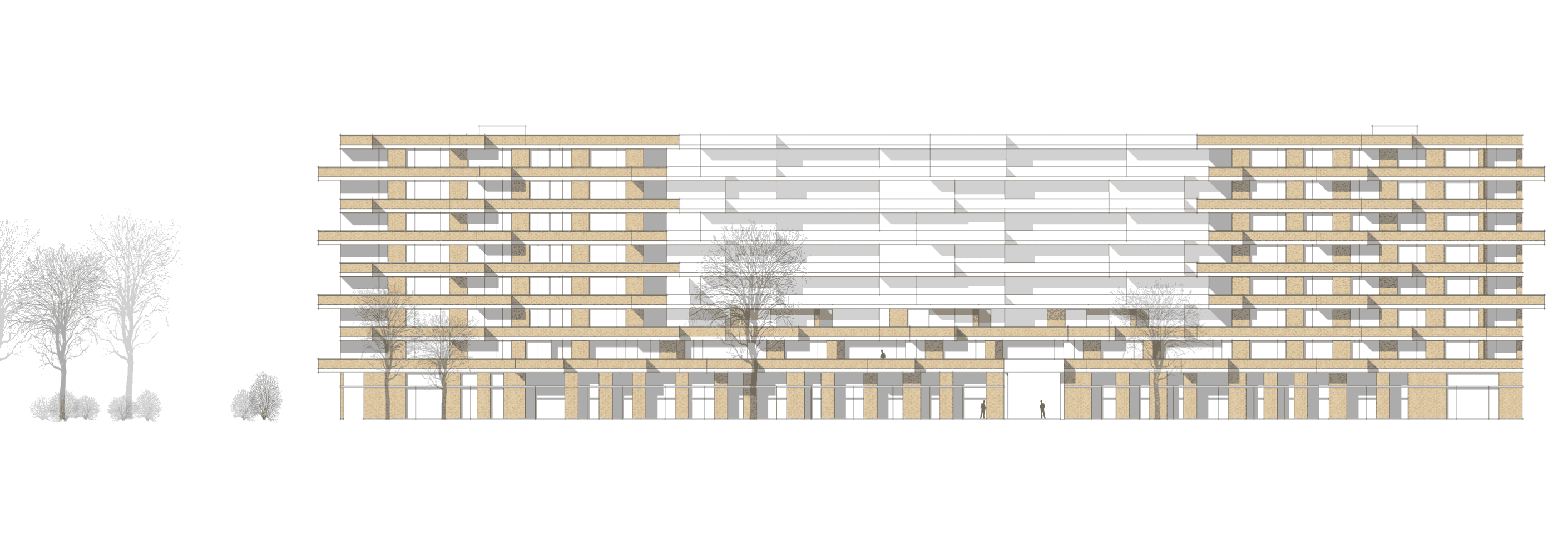 An der Brandstrasse präsentiert sich das Haus als ein über einem klassischen Betonsockel gestappelter Körper, der sich mit seinen Terrassen, Veranden und Balkone Richtung Park immer mehr mit der urbanen Natur verzahnt. Jede Fassade erhält durch Vor- und Rücksprünge eine eigene reliefartige Qualität – stärker gegen den Park und den Hof, subtiler gegen die Brandstrasse, wo die Fassade in flachem Winkel und durch zwei Reihen Alleebäume gefiltert wahrgenommen wird. Der helle Backstein zusammen mit dem Beton erinnert an die industrielle Geschichte des Ortes. Er verschafft dem massiven Haus aber auch eine menschliche Masstäblichkeit und eine wohltuende Handwerklichkeit.