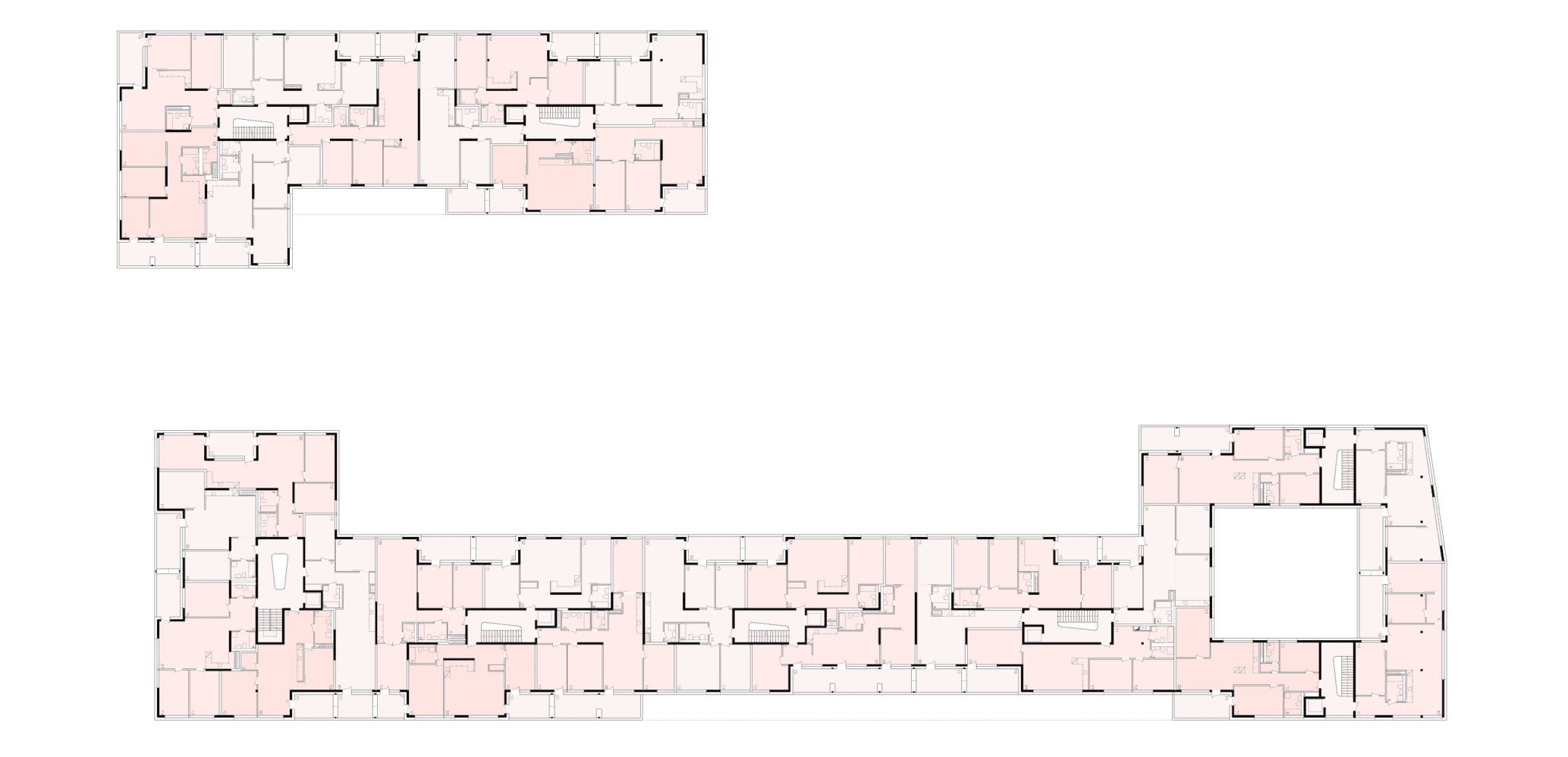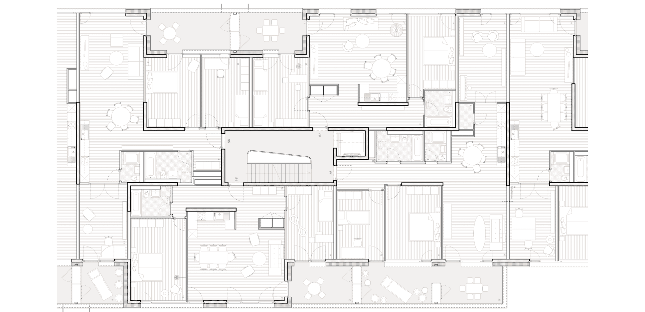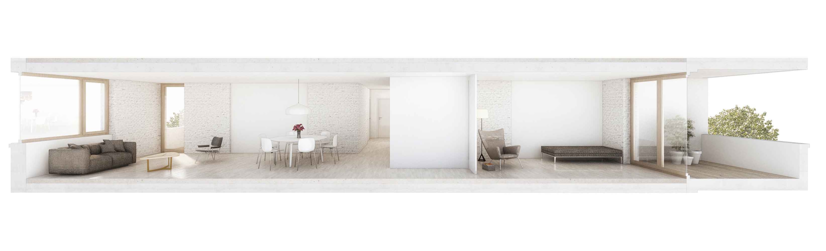 Das Innere der Gebäude lebt von der Spannung zwischen tragenden Wandscheiben und Leichtbauwänden. Durch die leicht zurück versetzte Lage des Hauptgebäudes können die Balkone und Wohnzimmer trotz Strassenlärm gegen die Sonne ausgerichtet werden.