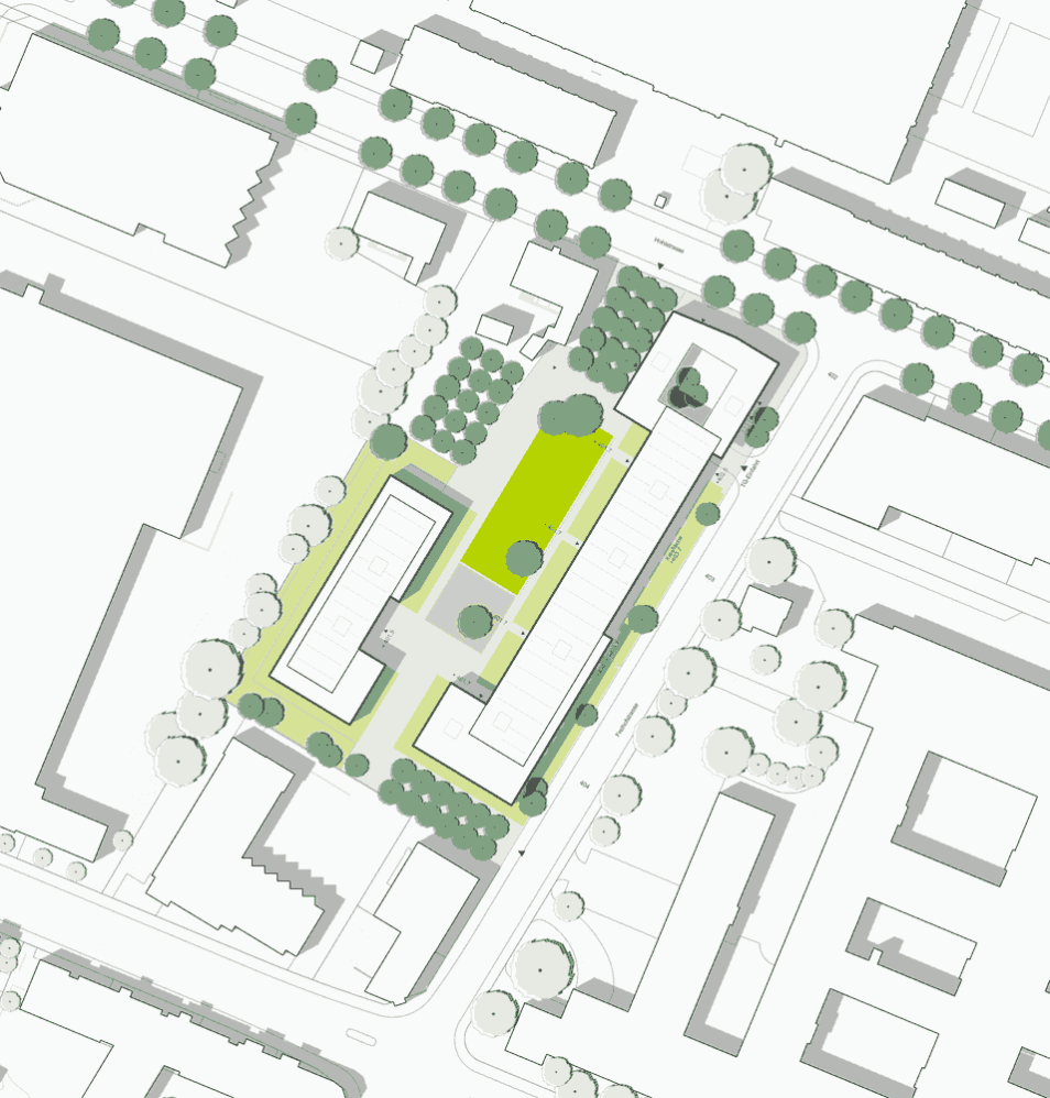 Auf dem Geviert spannen zwei markante Gebäude einen grossen Hof auf. Die Erschliessung des Hofs erfolgt über einen Haupteingang von der Hohlstrasse und einen Nebeneingang von der Freihofstrasse. Die Siedlung bekommt an der in Zukunft noch wichtigeren Hohlstrasse eine prominente Adresse.