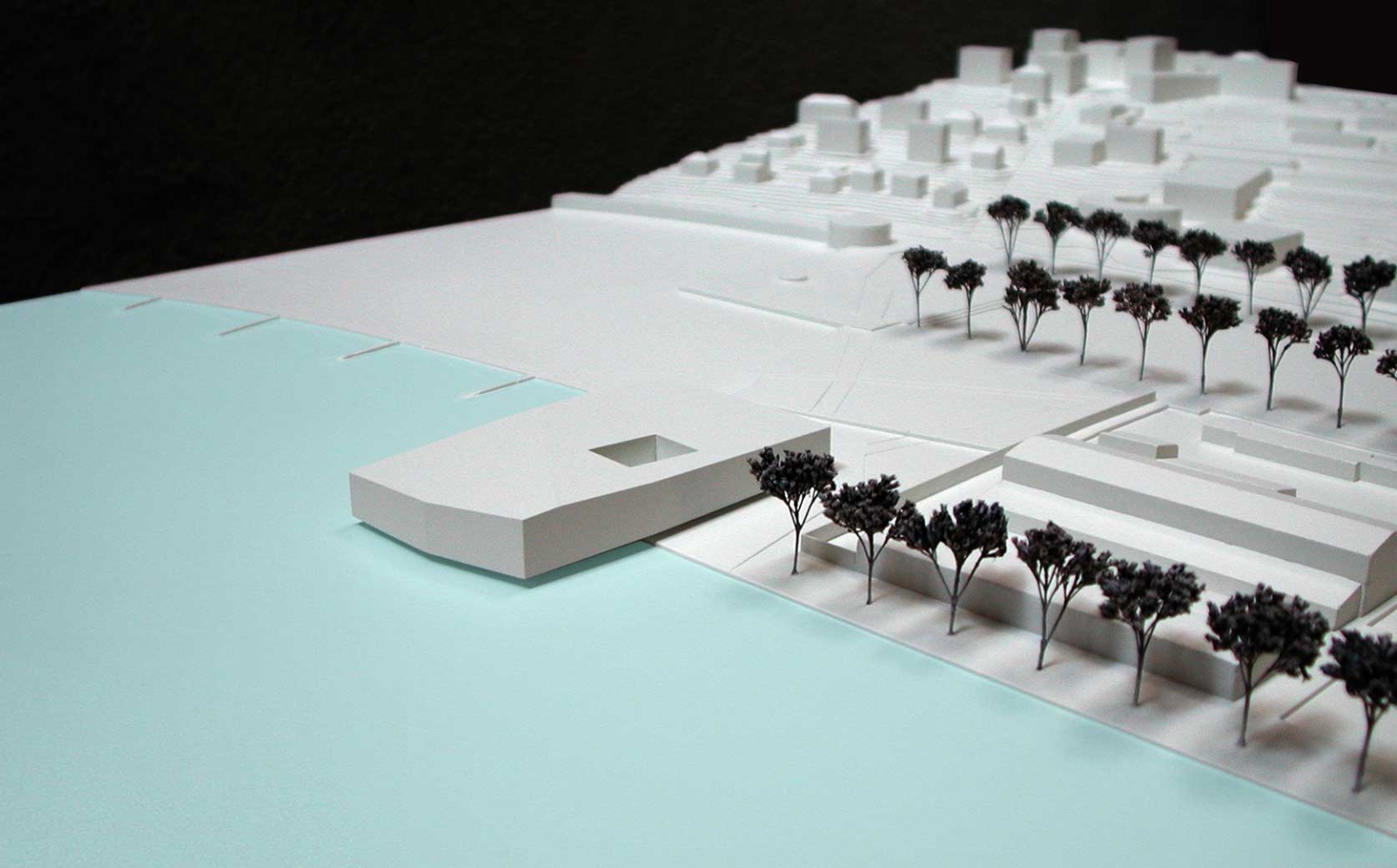 La rive du lac, entre Ouchy et Vidy, s’est considérablement transformée au cours du temps; le lac a notamment été repoussé au moyen de remblais. Le long de la rue de Rhodanie, devant la place de Bellerive et sur le môle juste devant le chantier naval, des lignées d’arbres disposées comme des anneaux de croissance marquent les étapes de l’évolution du terrain. C’est entre ces lignées végétales que se côtoient les différents espaces: la place de Belleville – utilisée tantôt comme place du cirque, tantôt comme lunapark et tantôt pour des places de stationnement – la piscine, le chantier naval et le terrain triangulaire du futur musée s’avançant dans le lac. À l’avant de ce terrain recouvert de roseaux, se trouve le bâtiment du musée. Comme un coquillage échoué sur le rivage, il témoigne d’une relation étroite entre la berge et le lac tout en gardant et protégeant son contenu précieux.